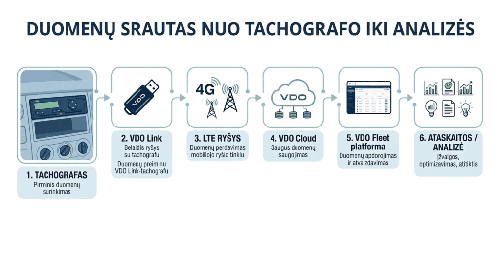 Su VDO Fleet ir VDO Link sprendimais galite automatizuoti tachografų duomenų atsisiuntimą, užtikrinti teisės aktų laikymąsi ir realiu laiku stebėti savo transporto parką.